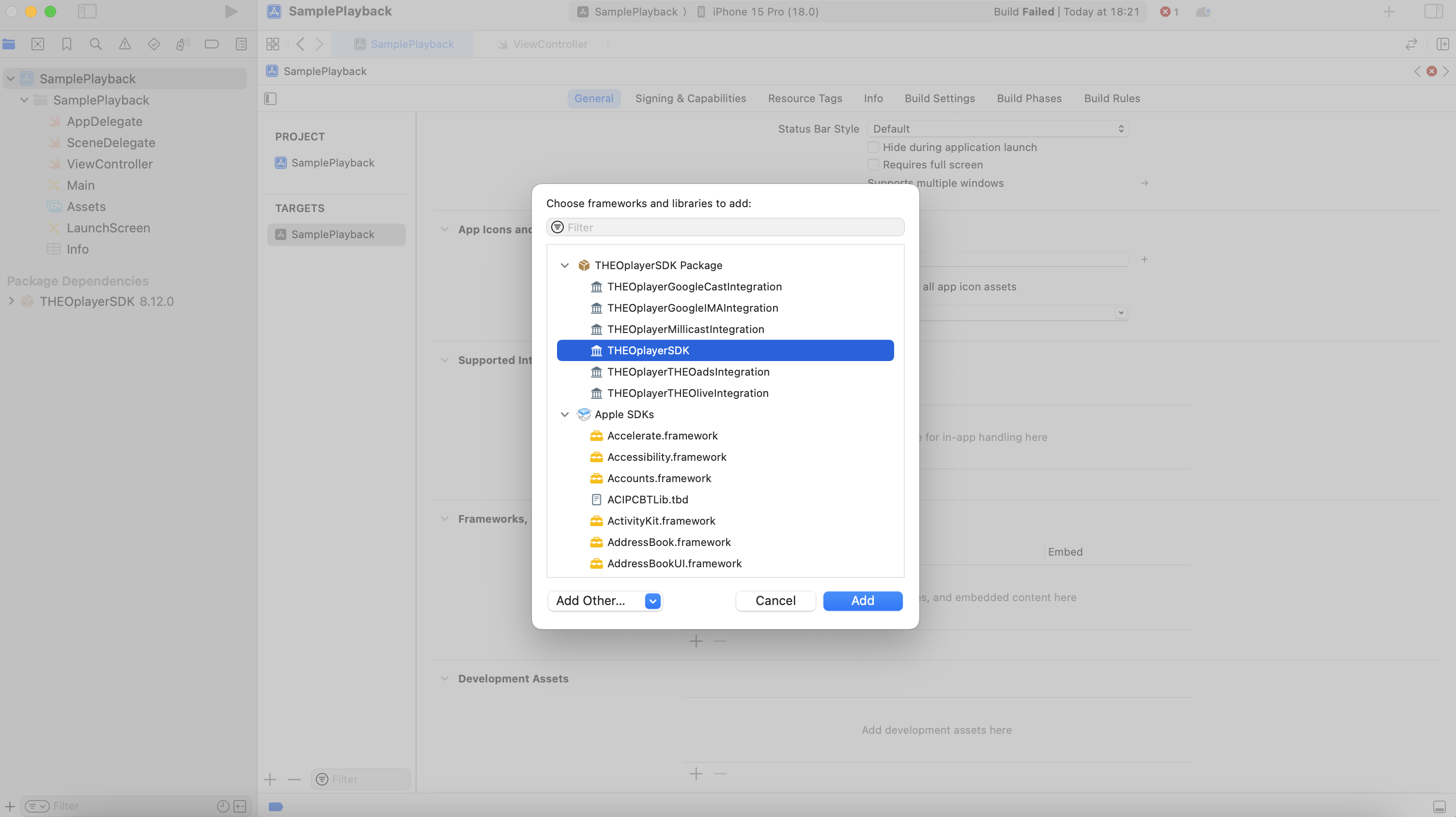 If Xcode fails to fetch the THEOplayer package, navigate in Terminal to the root directory of your project and run xcodebuild -resolvePackageDependencies. This will re-attempt to fetch the packages specified in the project. Restart your Xcode and the package dependencies should be in place.