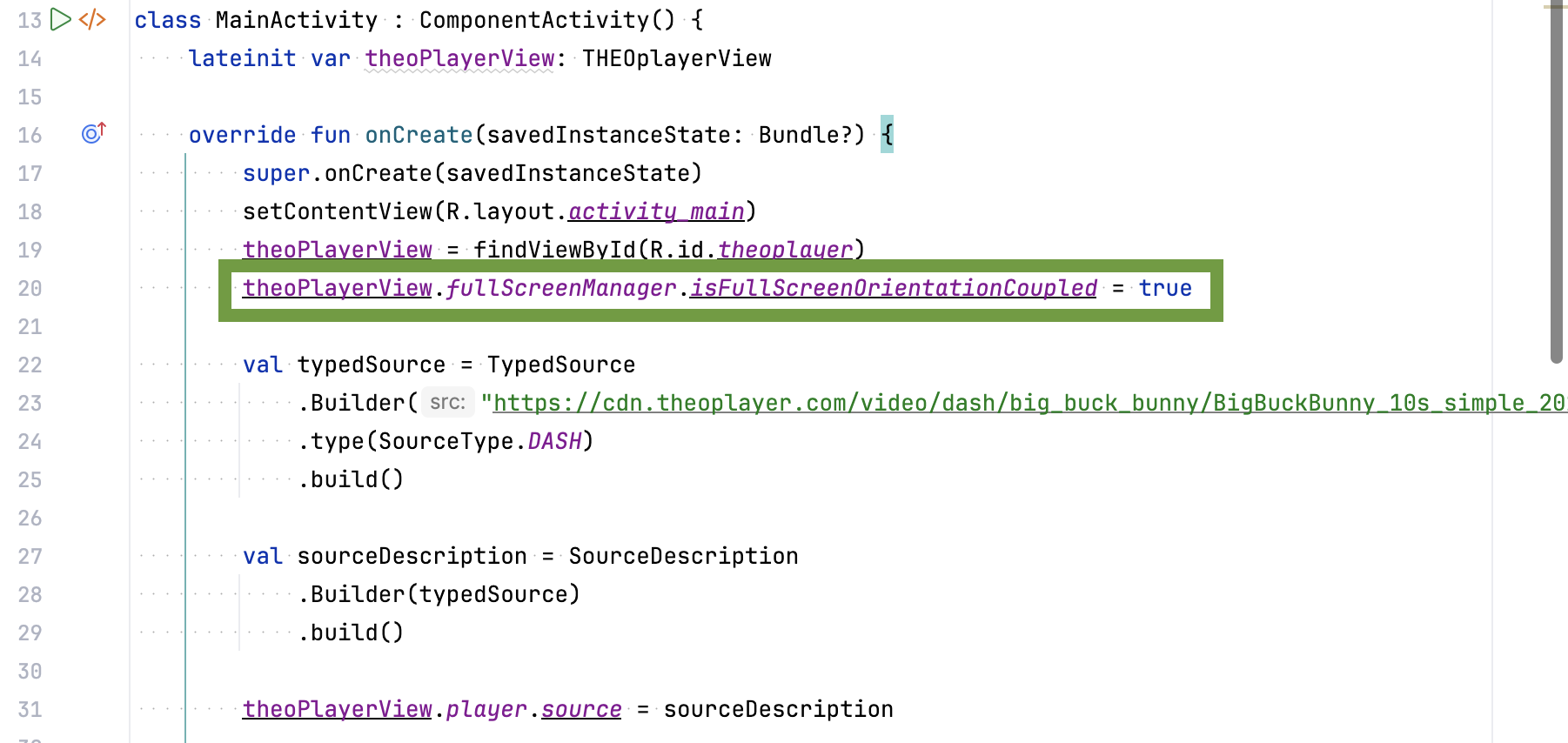 Now in the MainActivity we can retrieve the THEOplayerView by the id we set earlier using the findViewById method.